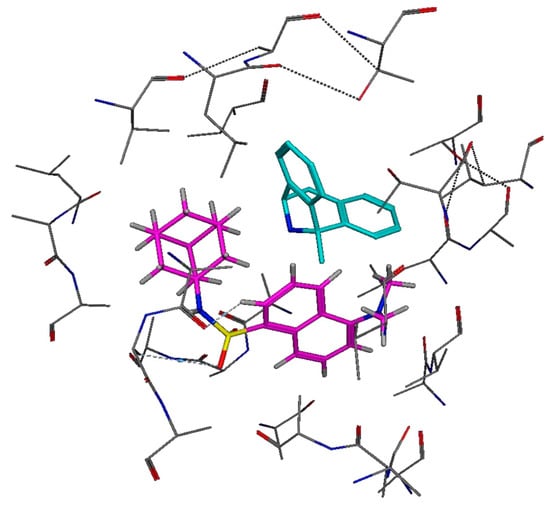 Molecular docking experiments were performed with MOE software [23], using the crystal structure of the NMDAR (Protein Data Bank I.D.: 5UOW), containing MK-801 as ligand (Figure 9) [9]. Molecular modelling studies were conducted in order to explore the interaction profile (Figure 10) and affinity of AM-DAN at the PCP binding site of the NMDAR. The energy minima structure of AM-DAN (MMFF94) was docked according to the protocol described in Section 2.6. AM-DAN was predicted to be able to access, interact and bind to the PCP binding site of the NMDAR within close proximity to MK-801 (Figure 9). Two hydrogen bond interactions were identified: (i) H-bond donor interaction between the heterocyclic ring of the dansyl backbone and ASN608; and an (ii) H-bond acceptor interaction between the S=O moiety of the sulphonamide and ASN603. This result was anticipated, based on the findings of the molecular orbital and theoretical calculations in Section 3.2. The binding affinity of AM-DAN was found to be −10.1640 kcal/mol and correlates well with the binding affinity of MK-801 (−12.0953 kcal/mol, Figure 9). The docking results therefore indicates that AM-DAN could be effective as a fluorescent ligand for NMDAR PCP-site fluorescent displacement studies.
