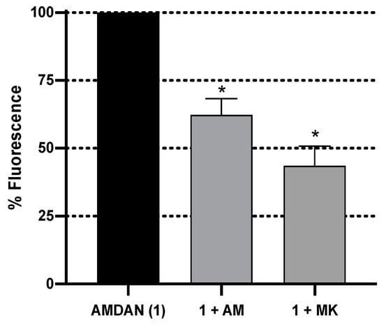 Fluorescent intensities (emission = 488 nm) of NMDA/glycine-mediated competition assay utilising AM-DAN (1, 15 μM) and known NMDAR inhibitors, amantadine (AM, 18 μM) and MK-801 (MK, 0.133 μM) in combination with AM-DAN (1). Each bar represents mean percentage values ± SEM (n = 3), (∗) p < 0.05.