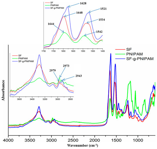FTIR spectra of silk fibroin (SF), poly(N-isopropylacrylamide) (PNIPAM) and SF-g-PNIPAM.