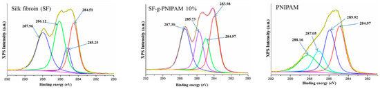 XPS analysis data confirmed the grafting of NIPAM monomer onto silk fibroin, and XPS also supported the RAMAN results. The high-resolution spectra of C 1s are shown in Figure 3. XPS analysis was carried out for crude silk fibroin (SF) and SF-g-PNIPAM (ratio 0.1 w/w to SF). The C 1s-specific main peak revealed a split for both spectra. Both C 1s main peaks can be divided into four secondary peaks through deconvolution due to the complex carbon natures of protein structures. Thus, the silk fibroin spectra showed four secondary C 1s peaks: a first peak centered at about 284.51 eV, corresponding to C-C; a second peak centered at 285.25 eV, which can be assigned to C-H (CH3 in alanine; -CH2- and -CH- in backbone); a third peak centered at 286.12 eV, which can be assigned to C-O/C-N; and a fourth peak centered at 287.96 eV, which can be assigned to C=O/N-C=O [34]. The C 1s spectra of PNIPAM revealed four peaks: a first peak centered at about 284.97 eV, assigned to C-C contribution, and three deconvoluted peaks centered at 285.92, 287.05 and 288.16 eV, assigned to multiple C-H groups, C-O/C- and C=O/N-C=O, respectively [35,36]. The C 1s spectra of SF-g-PNIPAM (0.1 w/w to SF) also revealed four peaks shifted to lower values with respect to the silk fibroin spectrum: the first peak was centered at about 283.98 eV, which can be assigned to C-C, with the contribution of a new carbon species from PNIPAM structures [35,36]. Furthermore, the C-C peaks with lower values than 284.5–284 eV are usually associated with the sp2 atom range [37]. The sp2 hybridization was present in the benzene ring of amino acid tyrosine. These results confirm a new C-C species that is directly bonded to the benzene ring of tyrosine via the grafting of NIPAM monomer. The next deconvoluted peaks were centered at 284.97, 285.73 and 287.39 eV, and can be attributed to multiple C-H groups, C-O/C- and C=O/N-C=O, respectively, with a contribution from the PNIPAM structure due to a shift towards lower values. Furthermore, the results of the atomic percentage ratio for C-C and -CH- peaks in SF-g-PNIPAM, as compared to silk fibroin, were 1:1.2 and 1:1.7, respectively. These results represent the contribution of the new species from PNIPAM and the crosslinked network, which increased the number of new carbon bonds. The results are in good correlation with the RAMAN spectra results.