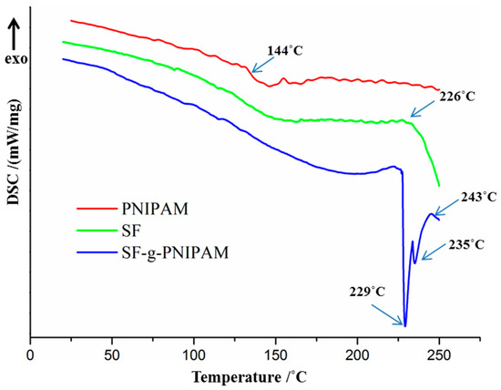 DSC curves of silk fibroin (SF), SF-g-PNIPAM and PNIPAM.