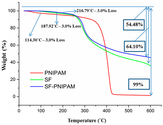 The thermal stability of the modified silk fibroin was directly related to the binding mode of the grafted NIPAM monomer within the silk fibroin structure. The thermogravimetric analysis, which investigated the thermal stability of regenerated silk fibroin and modified SF-g-PNIPAM (ratio 0.1 w/w to SF), is presented in Figure 6. Both samples showed a similar behavior among three subsequent regions in terms of shifting of temperature values. The first region occurred between 60–70 °C and 120–130 °C, due to the loss of the water traces. The second region occurred between 120–130 °C and 270–280 °C, with a slow mass loss probably due to the loss of the most volatile low molecular weight species coming from degradation. In this region, a mass loss of 3% was reached that was related to the temperature at which a polymer can be considered thermally stable. The silk fibroin showed a thermally stable temperature of about 188 °C, and SF-g-PNIPAM demonstrated a thermally stable temperature around 217 °C. This was probably due to a larger amount of water traces in the silk fibroin as compared to the modified one. Furthermore, the PNIPAM bridges led to an increase of the thermally stable temperature. The third region occurred between 270–280 °C and 600 °C, with a higher mass loss due to fibroin degradation resulting in gases such as carbon monoxide, carbon dioxide, hydrogen and nitrogen oxide [47]. The first step of this region could be attributed to the disintegration of the macromolecular side chains, which was likely followed by the main chain degradation and rearrangement of the carbon residues. PNIPAM revealed a lower thermal stability temperature at around 114 °C, but in fact thermal degradation appeared above 300 °C. PNIPAM demonstrated different thermal behavior than SF. Mass loss is significantly higher for SF, because PNIPAM displays a far simple chemical structure and does not lead to the generation of radicals that can react to one another, thus hindering nearly the entire mass loss. The SF-g-PNIPAM also had a lower mass loss rate and lower degradation percentage (54%) compared to the silk fibroin (64%), which was due to the crosslinking via PNIPAM bridges. These results suggest that the crosslinked network led to a slow increase in thermal stability for the SF-g-PNIPAM versus the crude silk fibroin.