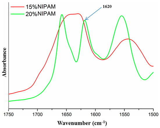 The grafted silk protein showed no solubility in lithium bromide aqueous solution or other solvents for crude silk fibroin. The dissolution tests of SF-g-PNIPAM revealed that grafting generated a modification of the solving behavior due to crosslinking bridges. The first step in understanding the mechanism is to determine the maximum amount of NIPAM monomer that can be grafted onto the silk fibroin substrate. The samples were subjected to FTIR analysis to check the presence of residual monomer. The residual monomer could be seen in FTIR spectrum by the presence of a C=C peak at 1620 cm−1, which is characteristic only to monomer structure. The samples obtained by variation of NIPAM (5–30%) with constant ACN (5%) showed a residual monomer beginning at 10% NIPAM concentration. The samples obtained by variation of NIPAM (5–30%) and ACN (2.5–15%) showed a residual monomer starting at 15% NIPAM/7.5% ACN concentrations (Figure 8). This suggests that higher amounts of ACN initiator can influence the crosslinking degree, likely due to the generation of additional reaction sites (although with an upper limitation). These results are sustained by the swelling tests, which showed a significant decrease of the swelling degree when increasing the crosslinking agent up to a 15% NIPAM concentration. An increase of NIPAM concentration over 15% induced no further changes, suggesting that this concentration could be the limitation of the monomer amount as a crosslinking agent (Figure 8, Table 1).