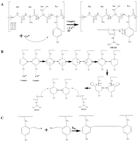 The generation of reactive sites by the initiator (Figure 9) could even have been limited by the number of available reaction sites in the silk fibroin structure. By consulting the literature data regarding initiation sites generated by Ce+4 in the polymer chains, it was revealed that the most suitable point for radical generation is the aliphatic CH2-OH group, rather than –CH2-, due to the contribution of hydroxyl groups [12,13,15]. In the case of silk fibroin having amino acids with aromatic side chains such as tyrosine and phenylalanine, the stability of radical structures is higher for aromatics. The first amino acids are four times more present and may activate the aromatic structure through hydroxyl groups. Therefore, the proposed mechanism shows that tyrosine is the main starting point for PNIPAM growth (Figure 9A).