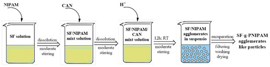 Polymers such as poly(N-isopropylacrylamide) (PNIPAM) are known for their thermosensitive response and PNIPAM is considered to be one of the smartest polymers that is sensitive to various environmental factors such as temperature or pH [25,26,27]. In this work, PNIPAM is used as a grafting agent of silk fibroin by generating some inter- and intra-molecular bridges. The mechanism of polymer grafting onto silk fibroin with ammonium cerium nitrate is shown and discussed in detail. This work is the first step in the design of novel smart drug delivery systems, such as self-assembled silk fibroin/PNIPAM nanocarriers, that possess a more controlled release profile compared to other systems based on native silk fibroin. Self-assembled drug delivery systems could be further developed thanks to the good interaction between PNIPAM bridges and hydrophilic active agents such as 5-fluorouracil.