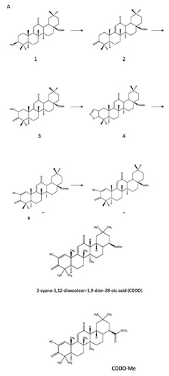 Total synthesis of naturally occurring pentacyclic triterpenes, which have at least eight chiral centers, and in particular of oleanolic acid, has been at the center of intense research activity for decades. The first enantioselective total synthesis of oleanolic acid was reported in 1993 [16]. Oleanolic acid derivatives were firstly synthesized in 1998, in an attempt to identify new inhibitors of nitric oxide (NO) production in macrophages [17]. Honda et al. randomly modified the structure of oleanolic acid and obtained about 60 compounds, which were tested in vitro as inhibitors of the production of NO induced by IFN-γ. Several compounds showed significant inhibitory activity and one of them (3,12-dioxoolean-1,9-dien-28-oic acid) displayed the highest activity (IC50 = 7 μM) [17]. In a following study, the same research group reported the synthesis of a much more potent compound, named CDDO, whose inhibitory activity was comparable to that of dexamethasone [18]. A further efficient and multi-gram level synthesis procedure of CDDO-Me was described in 2013 [19]. The synthesis pathway of CDDO, as described in [18] is illustrated in the Figure 2A; Figure 2B shows the structure of CDDO and of its methyl derivative, CDDO-Me.