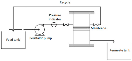 The illustration of the experimental set up is shown in Figure 1. The water permeability test was run using the crossflow-filtration mode. The cell was mounted with a flat sheet membrane with an effective filtration area of 9.075 cm2. The filtrations were conducted at room temperature and at a constant trans membrane pressure (TMP) of 1 bar. The feed solution was pumped through the filtration cell membrane using a peristaltic pump (Sci-323, Watson Marlow, Falmouth Cornwall, England). The water permeability (Wp) of the filtration was calculated using Equation (1).