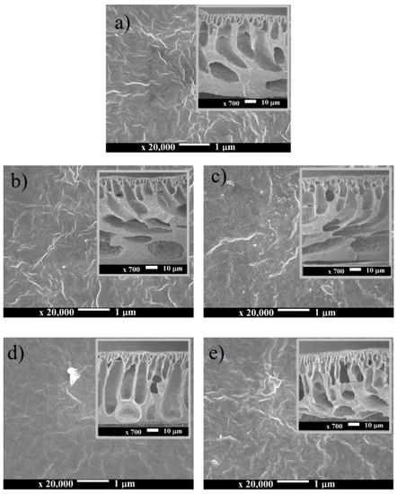 The microstructure SEM image of the morphology of the membrane surface and cross-section (in the inset) of pristine (a): F0, and modified membrane (b) FPc; (c) FPc-Si; (d) FVp; (e) FPv-Si.