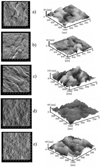 The 2D, and 3D AFM images of the surface of pristine (a) F0 and modified membranes (b) FPc; (c) FPc-Si; (d) FVp; (e) FPv-Si.
