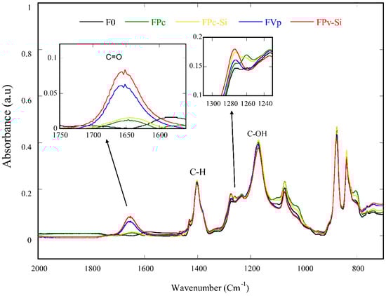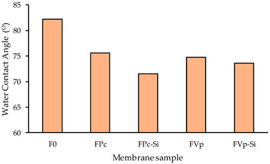 The hydrophilicity of the prepared membranes was evaluated through the WCA values as shown in Figure 4. It shows that the incorporation of additives in the dope solutions successfully increased the membrane surfaces’ hydrophilicity of the PVDF as reflected by the lower WCA values. The pristine PVDF showed the highest contact angle of ~81° and upon additions of either PVP or MPC; the WCA decreased to ~75 °C. The WCA for the PVDF membrane prepared by the dry/wet method, as applied in the current study, was often lower than 90° [31], despite being prepared from a PVDF polymer with a low surface tension because of the flat nature of the resulting membrane [32,33]. PVP is an additive widely known and appreciated for its hydrophilic characteristic [34,35,36]. Moreover, MPC has also been reported to have good interactions with water due to its zwitterionic properties and thus induces its hydrophilic property [27]. Figure 4 also shows that the addition of silica also decreased the WCAs for both PVP-bended and MPC-blended membranes thanks to the hydrophilic nature of the silica [37]. When the PVDF polymer was mixed with either PVP or MPC in the dope solutions, more abundant hydrophilic functional groups remained on the membrane matrices to impose their hydrophilic property. It is worth pointing out that the WCA of the FPc-Si was slightly lower than the FVp-Si, most likely because higher residual additives remained in the membrane matrix, as shown by the high intensity of C=O FTIR peaks in Figure 6.