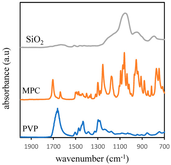 The presence of PVP displayed on the IR spectra at a peak of 1665 cm−1 was assigned to the carbonyl groups (C=O), as shown in Figure 5 and Figure 6. The characteristic of MPC can be ascribed by the presence of a peak at wavenumber 1260 cm−1, associated with C−O stretching. The adsorption of silica as an inorganic additive is represented by a weak peak at the wavelength of 1263 cm−1. The weak nature of the peak may be due to a low concentration of the silica present in the membrane matrix.