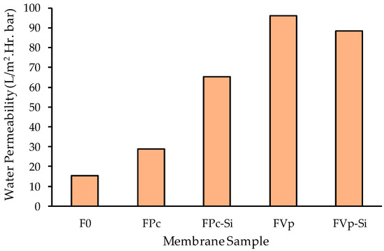 Unlike in FPc-Si, the water permeability of the FPV-Si is slightly lower than the FPv (Figure 7). As detailed in Table 1, the composition of the dope solution for FPv-Si is from the dope solution of FPv and addition of SiO2. The PVP additive is a hydrophilic polymer with a large molecular weight with strong impact on increasing the dope solution viscosity. Hence, the addition of SiO2 into the dope solution containing PVP further increases the solution viscosity. Under this condition, the kinetic effect dominates the phase inversion process. High dope solution viscosity leads to a lower rate of solvent–nonsolvent exchange in the coagulation bath, which results in a denser membrane with lower hydraulic performance. A membrane with low porosity has lower clean water permeability as reported earlier [11,26]. The morphology of the FPV-Si membrane exhibited in Figure 2 also proves that macrovoid geometry in the FPv-Si membrane is narrower than the ones in the FPv membrane.