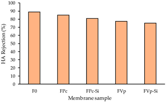 Increasing the water permeability as the result of the incorporation of additives does not significantly affect the HA rejection in the feed solution of 10 ppm HA solution, as shown in Figure 8. The rejection of HA by all modified PVDF membranes ranged from −75% to 90%. Such rejections were also reflected by the appearances of the feed and permeate solutions of the FPv-Si membrane displayed in Figure 9. The rejection values were considered to be high when considering the low concentration of HA in the feed solution (10 ppm). Higher rejections are expected when treating a solution with a higher HA concentration.