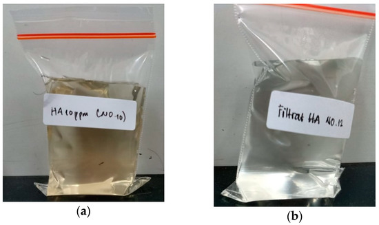 The appearance of the feed humic acid solution (10 ppm) (a) and the permeate after filtration by the FPV-Si membrane (b).