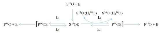 Reaction 3: Fractionation of oxygen isotope 18O is observed when k1 ≈ k2; k3 >> k4; k3 >> k1. Note: S—(bio-)chemical substrate; P—product of (bio-)chemical reaction; E—enzyme (catalyst).