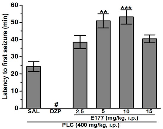 Effects of pretreatment with DZP and H3R antagonist E177 on latency time to PLC-induced seizure. Effects of acute systemic injection with E177 (2.5, 5, 10, and 15 mg/kg, i.p.) or DZP (10 mg/kg, i.p.) on latency time (min) to the first PLC-induced seizure. ** p < 0.01 as compared with PLC group, *** p < 0.001 as compared with PLC group, # Full protection as compared to PLC group. Results are expressed as mean ± S.E.M (n = 8).