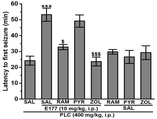 The abrogation of the most promising protective dose of E177 (10 mg/kg, i.p.) was evaluated by systemic co-injection of RAM (10 mg/kg i.p.), PYR (10 mg/kg i.p.), and ZOL (10 mg/kg i.p.) before PLC injection (Figure 2). The results showed that PYR (10 mg/kg i.p.) co-administration failed to significantly abrogate the average of the latency to first seizure and SE incidence average in comparison to animals treated with E177 (10 mg/kg) (p > 0.05). However, co-injection with ZOL (10 mg/kg i.p.) significantly reversed the protective effects of E177 (10 mg/kg) on the average of latency to first seizure (23.66 ± 2.79 min, p < 0.001). Also, co-injection with ZOL partially reversed the SE incidence average to 100% (p < 0.05) and reduced the survival rate to 83.33% (p < 0.05) (Figure 2 and Table 1). Moreover, co-injection with RAM (10 mg/kg i.p.) significantly decreased the average of the latency to first seizure to 32.80 ± 1.45 min (p < 0.05) (Figure 2), and raised the SE incidence average to 66.67% (Table 1), and no change was observed on the level of survival rate (Table 1). Notably, systemic administration of RAM, PYR, and ZOL alone did not alter the average of the latency to first seizure and SE incidence average in comparison to PLC group (p > 0.05) (Figure 2).