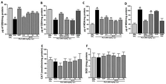 The results indicated that malondialdehyde (MDA) levels were significantly increased in the PLC group when compared to the control group treated with saline (p < 0.001), while glutathione (GSH) levels were markedly decreased (p < 0.0001), and no significant difference was observed of both catalase (CAT) and superoxide dismutase (SOD) levels (Figure 3E,F). Moreover, the observed results showed that glutathione (GSH) levels were noticeably elevated in the DZP group (p < 0.001) as compared to the PLC group, also MDA levels were significantly reduced in the DZP group (p < 0.05) as compared to PLC group (Figure 3A,C). Furthermore, the results showed that pre-treatment with E177 (2.5, 5, 10 and 15 mg/kg, i.p.) significantly reduced MDA levels (all p < 0.05) when compared to PLC group. In addition, the results demonstrated that pretreatment with E177 (5, 10 and 15 mg/kg, i.p.) markedly increased GSH levels (all p < 0.01) in comparison to the PLC group, while unnoticeable change was observed in animals treated with the lower dose of E177 (2.5 mg/kg, i.p.) (Figure 3A). Interestingly, the results indicated that pretreatment with RAM (10 mg/kg i.p.) significantly abrogated the protective effect observed by E177 (10 mg/kg i.p.) on the levels of MDA and GSH (all p < 0.01) (Figure 3B,D). Notably, RAM administered alone with PLC or with SAL did not modulate the levels of MDA and GSH in comparison to PLC group as well as SAL group (all p > 0.05).