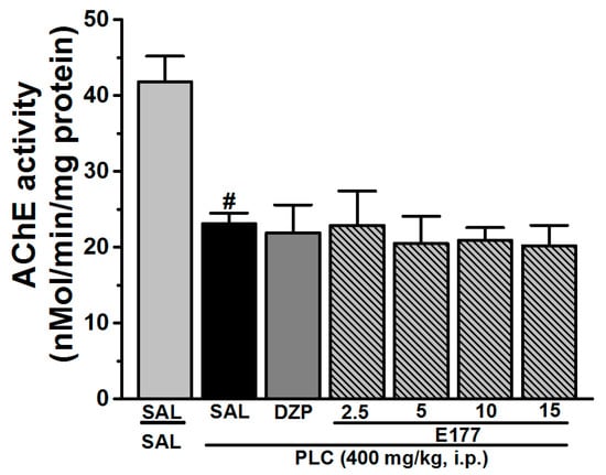 The results showed that acetylcholine esterase (AChE) activity was significantly decreased in the PLC group (p < 0.001) when compared to the control group (Figure 4). However, no significant change was observed in animals pretreated with E177 (2.5, 5, 10, and 15 mg/kg, i.p.) (Figure 4).