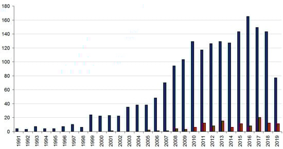 Annual numbers of publications on the topic of ring-opening polymerization of cyclic esters (blue) and numbers of publications that include DFT modeling of ROP (red), Web of Science data (Thomson-Reuters, October 30, 2019).