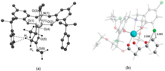 The key findings on the mechanism of βBL polymerization, catalyzed by model yttrium complex 2 (Figure 2b), were made by Carpentier et al. [36] using DFT modeling at the BP86/def-TZVP level of theory [48,49]. They demonstrated that the valuable contribution of C–H···π interactions between the methylene hydrogen of the butyrate moiety (Ha) and both the ortho- and meta-carbon atoms of a phenyl ring of CMe2Ph substituent (Figure 3a) control the formation of isotactic poly(βBL). The results reported in [36] were in line with the fundamental hypothesis of a ligand-assisted stereocontrol mechanism pointed out by Rzepa et al. [50] for lactide polymerization (see Section 4.1).