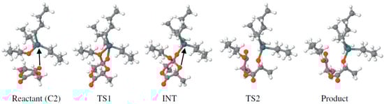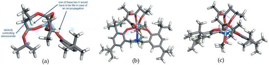 Polymerization of βBL catalyzed by yttrium complex 5d (Figure 2b) was studied by Rieger et al. [39] at the BP86/def-TZVP level of theory [44,45,46,47,48,49]. The full reaction profile was calculated; it was found that the formation of syndiotactic polymer is preferable due to the lower activation barrier (>5 kcal/mol). The detailed analysis of the stereochemistry of the conformers at the rate limiting transition states (Figure 4) allows one to explain this difference.