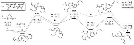 Carpentier et al. studied ROP of 4-alkoxymethyl-β-propiolactones (βPLOR) catalyzed by a series of yttrium complexes with η4-coordinated NOXO-type ligands containing different substituents in benzene rings (6a–h, Figure 2b) [40] and found that the nature of substituents in benzene rings had a direct impact on polymer stereochemistry. At the same time, the nature of the alkoxy substituents in βPLOR had no impact on stereoselectivity of ROP. DFT modeling of the second monomer insertion that is the key stage for explanation of the ROP stereoselectivity, was based on the results of previous work [37]. The calculated free energies (ΔG) of the first two steps for 6a-catalyzed process were similar for both the iso- and syndioselective routes (Figure 5). However, the second transition state leading to syndiotactic poly(βPLOAllyl) (III-SR-TS) was notably higher in energy (ΔG≠ = 11.6 kcal/mol) than the transition state leading to an isotactic polymer (III-SS-TS, ΔG≠ = 6.2 kcal/mol).