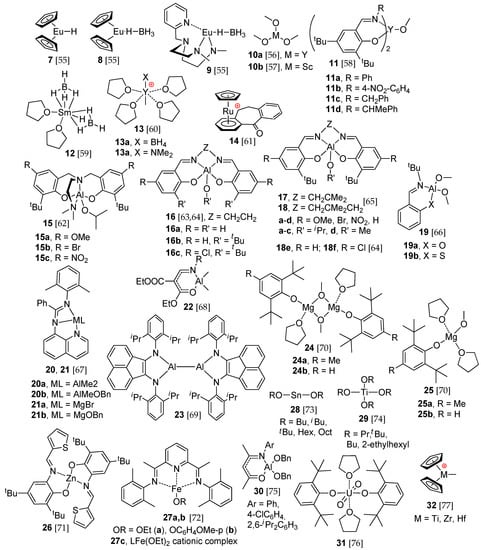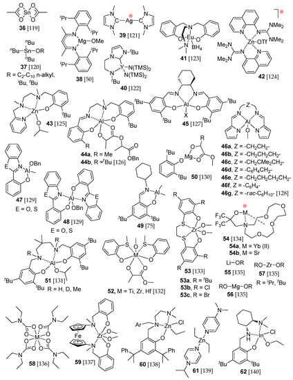 Metal complexes studied in DFT modeling of εCL ROP [55,56,57,58,59,60,61,62,63,64,65,66,67,68,69,70,71,72,73,74,75,76,77].