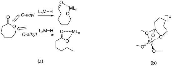 (a) Possible εCL ring-cleavage pathways in the reaction with metal-hydride complexes [55]; (b) The pendulum transition state [57] the likes of which are often overlooked in DFT modeling of ROP.