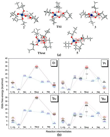(a) Calculated structures of stationary points (2, TS1, 3, TSrot, and 5) along the εCL ROP pathway for Al(OsBu)3 catalyst. Distances are given in Å. The Wiberg bond indices are indicated in brackets; (b) Calculated Gibbs free-energy profiles for the initiation of εCL ROP promoted by [Me2Al(OR)] (blue), [(MeO)2Al(OR)] (red) and [Al(OR)3] (black) with R = Et, iPr, tBu, sBu. Reprinted with permission from [87]. Copyright (2016) Elsevier B.V.