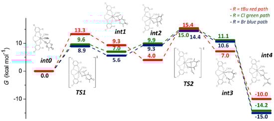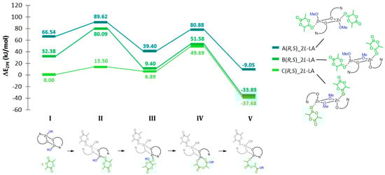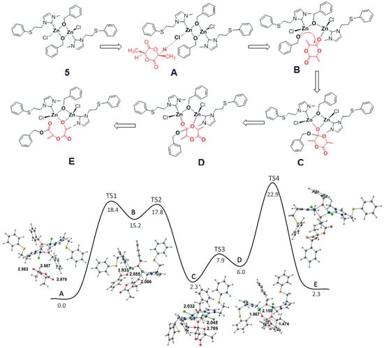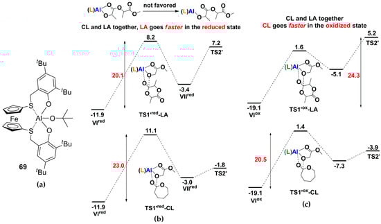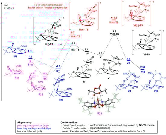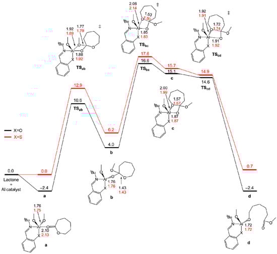 Polydentate ligands mentioned above contained N and O donor atoms. Research groups at Taiwan Kaohsiung Medical University and National Sun Yat-Sen University studied experimentally and theoretically catalytic properties of Al complexes with aryloxy-imino and arylthio-imino ligands (19a and 19b, respectively, Figure 6) [66]. The results of polymer-tests and DFT modeling at B3LYP-D3/6-311+G**//6-31G* level (Figure 9) demonstrated an obvious advantage of sulfur-containing complex 19b as εCL ROP catalyst. It must be pointed out, that the pendilim transition state (the second TS in Figure 9) determines the activation barrier of the reaction.