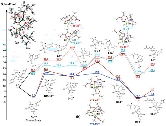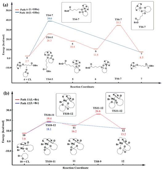Al and Mg complexes (20 and 21, respectively, Figure 6) with specific NNN-type ligand were studied in εCL ROP by Sun, Lei et al. [67] using DFT modeling at the ωB97X-D/6-31G⁄* level of theory [79,88]. For Al complexes 20, two different reaction mechanisms have been analyzed. The first of them was close to the mechanism presented in Scheme 2. The alternative way included the coordination of an exocyclic oxygen atom. At the initiation stage, the first way was found to be highly preferable, such preference has been maintained at the propagation stage (Figure 10a). In the case of Mg complexes 21, one of the nitrogen atoms initiated ROP, and for 21b the propagation resulted in formation of metallacyclic species (Figure 10b). In summary, the results of DFT modeling predicted higher catalytic activity for Mg complexes.