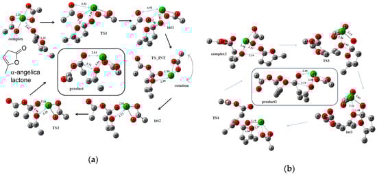 Five-membered lactones such as γBL have traditionally been considered as non-polymerizable due to the low strain energy of the ring and to the positive Gibbs free energy related to the polymerization [32]. However, the introduction of C=C bond into five-membered lactone results in monomer that can be polymerized by ROP. α-Angelica lactone (αAL, Figure 13) is an attractive cyclic substrate, furthermore it can easily be obtained from levulinic acid that is commercially available green bioplatform chemical. αAL has higher strain energy than γBL and negative enthalpy of polymerization although it is a five-membered lactone, this fact correlates with DFT modeling results [104]. Kınal et al. performed a theoretical study of αAL polymerization catalyzed by [Sn(Oct)2] by employing the semiempirical PM6, PM6-D3H4, PM7, and the DFT-B3LYP, B3LYP-D2 and ωB97X-D methods in both gas and solvent (toluene, THF, DMF and DMSO) media, Sn(II) acetate was used as a model initiator. In line with the results of the modeling, the initiation stage included the nucleophilic attack of carboxylate, weak coordination of endocyclic oxygen atom, and ring-opening (Figure 13a). The ring-opening stage was rate-limiting (ΔG≠ = 30–37 kcal/mol depending on DFT method used). The calculated activation barrier of the propagation stage (Figure 13b) was substantially lower (~15 kcal/mol).