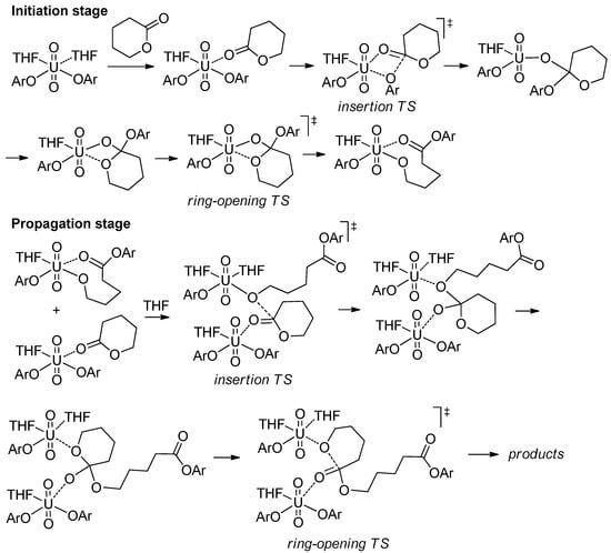 δVL and εCL ROP, catalyzed by uranium complex 31, was studied experimentally and theoretically by Maron et al. [76]. The formation of macrocyclic polylactones was detected experimentally, the results of DFT modeling allowed to propose a novel type of ROP mechanism, namely, intermolecular coordination-insertion involving two uranyl catalytic species (Figure 14). The calculated free activation energies for the stage of the insertion and ring-opening of the second lactone molecule were 14.0 and 20.8 kcal/mol for δVL and εCL, respectively. The authors proposed that a number of mechanism studies of lactone ROP may have to be reinvestigated to consider intermolecular pathways, and this assumption feels right and prospective for further study of polymerization of cyclic esters.