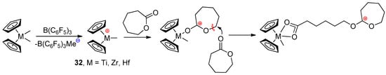 Except cationic complex 14, the initiators mentioned above catalyze ROP of lactones by similar mechanisms that include nucleophilic attack of the metal-coordinated ligand to carbonyl group followed by ring-opening via O-acyl bond cleavage (Scheme 2). The mechanism of ROP catalyzed by 14 slightly differ from this common scheme by the participance of non-coordinated nucleophilic agent (ROH). However, metal-catalyzed ROP of lactones may occur by a far different living cationic mechanism (Figure 15) that was studied in silico by Jitonnom and Meelua for (η5-C5H5)2MMe cations 32 [77] at the B3LYP/6-31G*-LANL2DZ [51,53,54,78] level. These calculations were performed for gas phase and using CPCM solvent model for THF, CHCl3, toluene and hexane. The reactivity of other lactones and cyclic carbonates was also estimated, taking into consideration the donor properties of monomers and the ring strain. Technically, this reaction cannot be regarded as coordination-insertion ROP, but the nature of the complex 32 have a direct impact on the initiation step, therefore we included this work in the review.