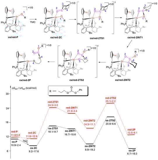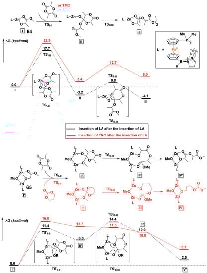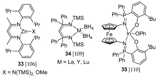 The use of heterobimetallic complexes is one promising strategy in catalyst design [111,112]. In TMC ROP, indium complex 35 bearing a with redox-switchable ferrocene-based ligand was studied experimentally and theoretically [110] at B3LYP/6-31G* [51,53,54] level (Figure 18).