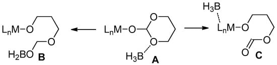 DFT modeling of TMC ROP initiation by rare-earth metal borohydride complexes 34 was performed by Guillaume et al. [109] at the B3PW91 [51,52] level. Several unprecedented features were revealed in comparison with the initiation of lactone ROP [60,81,82]: the formation of easy accessible (without activation barrier) intermediate A after rate-limiting nucleophilic attack of BH4 to TMC molecule (ΔG≠ ~ 24 kcal/mol) was located, and two distinct processes with similar activation barriers have been computationally identified. These processes resulted in qualitatively different reaction products B and C (Figure 17).