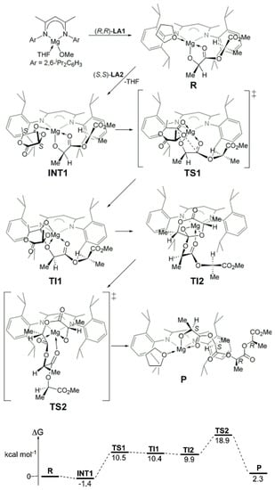 Thorough DFT modeling of rac-βBL polymerization catalyzed by yttrium complex 3 was performed by Thomas, Maron et al. [37] at the B3PW91 level of theory [51,52] in order to clarify the experimental fact of formation of syndiotactic polymer. The calculated activation barrier of the initiation stage was ~15 kcal/mol, and the chelate complex formed after the initiation stage was used of the model catalytic complex for the simulation of the propagation stage. Detailed analysis of eight reaction pathways based on the stereochemistry of (OCHMeCH2COOiPr) chelate fragment and second molecule of βBL (SS, SR, RS and RR sequences), and chelate–monomer orientations (front-side and back-side) was performed. The results of calculations confirmed the preference of syndiotactic poly(βBL) formation without regard to the stereochemistry of the first inserted βBL molecule.
