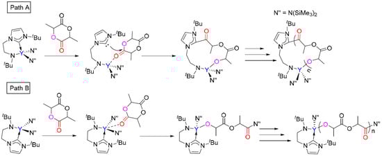 Luo et al. [41] performed DFT modeling at the B3LYP/6-31G*+ECP [51,53,54] level of theory of the initiation stage of βBL polymerization, catalyzed by yttrium 2-methoxyethylamino- bis(phenolate)s with different κ1-bonded ligands Nu (5a–c, Figure 2b) that act as nucleophilic initiators of ROP. The sequence of the SP and TS was close to the one presented in common Scheme 2. For Nu = iPr the relative free energy of the transition state of nucleophilic attack (TS-1) was minimal, but the ring-opening transition state TS-2 was higher by free energy. The calculated activation barriers of the initiation stage were 24.2, 22.6 and 19.0 kcal/mol for Nu = CH2SiMe3, N(SiMe3)2 and OiPr, respectively.