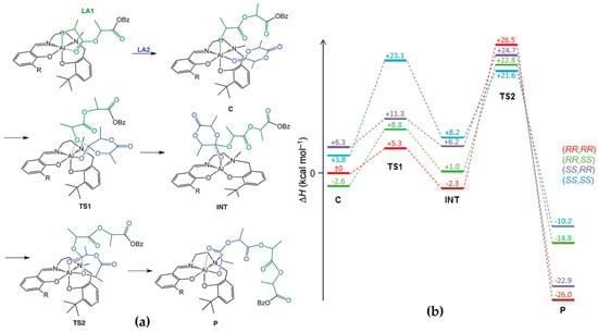 The formation of isotactic PHB in β-butyrolactone polymerization, catalyzed by achiral chromium complex 1 (Figure 2b), was established experimentally and explained by the results of DFT modeling by Rieger et al. [35] at the BP86/SV(P) [44,45,46,47] level of theory using the TZVP basis set [48]. They demonstrated that the formation of isotactic PHB can be attributed to binuclear ROP mechanism via the formation of sandwich-like structure that opens a chiral reaction channel.