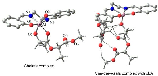 The influence of the geometry of catalytic complex based on aluminium chelate 22 (Figure 6) on activation barrier of εCL ROP was studied by Chen et al. [68] at the B3LYP/6-31G* level [51,53,54]. The nucleophilic attack to carbonyl carbon was found to be a limiting step of ROP, the value of the activation energy depended on the structure of the substituent at nitrogen atom of the chelate ligand, 4-chlorophenyl derivative demonstrated the best activity.