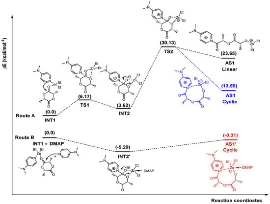 Other lactones, e.g., δ-valerolactone (δVL) or non-strained and non-polymerizable γ-butyrolactone (γBL) and γ-valerolactone (γVL) were investigated occasionally. In [87], Meelua et al. compared the reactivity of different ring-size lactones (εCL, δVL, γBL and γVL) in [Al(OsBu)3]-catalyzed ROP. Similar to εCL, the initiation of ROP of other lactones proceeds via two transition states with the rate-determining second TSrot. The activation free-energies for the initiation were slightly increased with decreasing of the ring size (24.5, 27.3, 28.6, and 28.8 kcal/mol for εCL, δVL, γBL and γVL, respectively), thus, the polymerizability of 5-membered ring lactones (γBL and γVL) was kinetically less favorable.