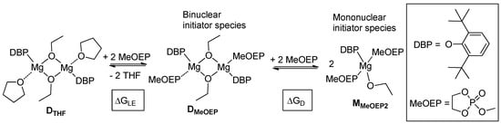 Polymerization of βBL catalyzed by borohydride complex [La(THF)3(BH4)3] (4, Figure 2b) was studied experimentally and theoretically at the B3PW91 [51,52] level of theory by Carpentier et al. [38]. It was demonstrated that at the initiation stage the complex anion BH4− acts as a nucleophilic agent, BH4− attack goes simultaneously with a coordination of exocyclic oxygen atom via the transition state with highest value of ΔG (14.5 kcal/mol). The initiation sequence involved the additional steps of hydride transfers with ring-opening leading to the formation of H2BOCH2CH2CH(O)Me alkoxy complex (oxygen atom in brackets is bonded with La atom). DFT modeling of the propagation stage was performed for two possible reaction pathways and resulted in conclusion about the equal possibilities of these mechanisms with the absence of stereocontrol. The formation of atactic polymer is in line with calculation results, but the reasons of sharp MWD (ĐM ~ 1.03–1.09) are unclear bearing in mind the multifaceted nature of the reaction mechanisms predicted in silico.