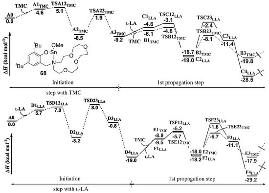 A comparative DFT study of [Sn(OBu)2]-catalyzed ROP of γ-valerolactone (γVL), δVL and LA, was performed by Kungwan et al. [103] at the B3LYP/LANL2DZ level of theory [51,53,78]. The sequence of stationary complexes and TS applied in simulation of the reaction profile was fully in line with Scheme 2. Taking account of DFT modeling of ROP performed previously by this scientific group [73], the free activation energy values were 13.8, 18.6, 18.8 and 12.3 kcal/mol for γVL, δVL, εCL and LA, respectively. The authors estimated the activation energies as a difference between the free energy of the first transition state and the sum of the free energies of Sn(OBu)2 and corresponding cyclic ester, and proposed the following order of the rate constants: γVL = LA > εCL > δVL which is not in agreement with experimental observations.