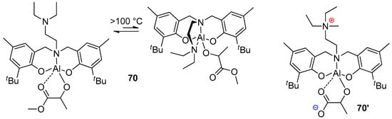 High-quality modeling of εCL ROP initiation by aluminium complexes 30 (Figure 8) was performed by Lin and Jheng [75] at the B3LYP/6–31g(d) [51,53,54] level using the polarizable continuum solvation model (PCM) [102]. They demonstrated that the step of benzoxide insertion was rate-limiting, and the bulkiness of aryl substituent in ketiminate ligand facilitated ROP. However, only initiation stage was studied thoroughly, and correlations between experimental data and calculated thermochemistry appeared controversial.