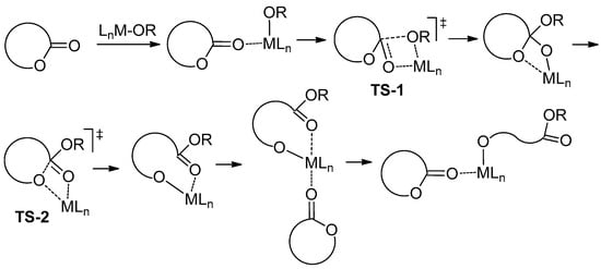 While on the surface the mechanisms of ROP catalyzed by metal complexes seem to be diverse and cumbersome, most of them could be described in the framework of the common sequence of stationary points (SP) and transition states (TS) named coordination-insertion mechanism (Scheme 2) [11,22,23,24]. The metal atom plays the role of the electrophilic catalytic center that coordinate the molecule of the cyclic ester. This coordination results in activation of the carbon atom of the carbonyl group for cyclic esters or phosphorus atom for cyclic phosphates. The initiator (alkoxy, amino, alkyl etc.) can be directly bonded or weakly coordinated with the metal. Such dual monomer and initiator coordination forms a reaction complex. The first step of the initiation stage is a nucleophilic attack with a formation of the tetrahedral carbon (or pentahedral phosphorus) followed by coordination of the exocyclic oxygen. The second step is a ring-opening, and the final step is a loss of the coordination of carbonyl (or phosphate) oxygen atom of the ring-opened product with simultaneous or subsequent coordination of the molecule of cyclic substrate at the metal atom. At the propagation stage, the alkoxy fragment plays the role of an initiator.