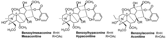 - Li, T.F.; Gong, N.; Wang, Y.X. Ester hydrolysis differentially reduces aconitine-induced anti-hypersensitivity and acute neurotoxicity: Involvement of spinal microglial dynorphin expression and implications for Aconitum processing. Front. Pharmacol. 2016, 7, 367. [Google Scholar] [CrossRef]