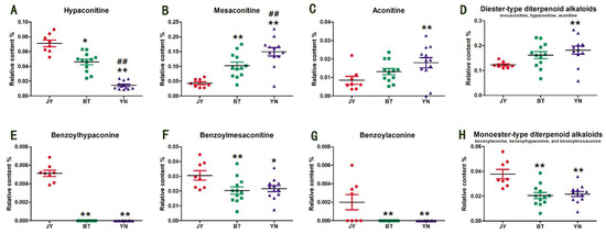 Relative contents of hypaconine (A), mesaconitine (B), aconitine (C), diester-type diterpenoid alkaloids (D), benzoylhypaconine (E), benzoylmesaconine (F), benzoylaconine (G), and monoester-type diterpenoid alkaloids (H) in the Fuzi samples from Jiangyou, Butuo, and Yunnan. JY is the Fuzi from Jiangyou; BT is the Fuzi from Butuo; and YN is the Fuzi from Yunnan. * p < 0.05 vs. JY, ** p < 0.01 vs. JY; # p < 0.05 vs. BT, ## p < 0.01 vs. BT.