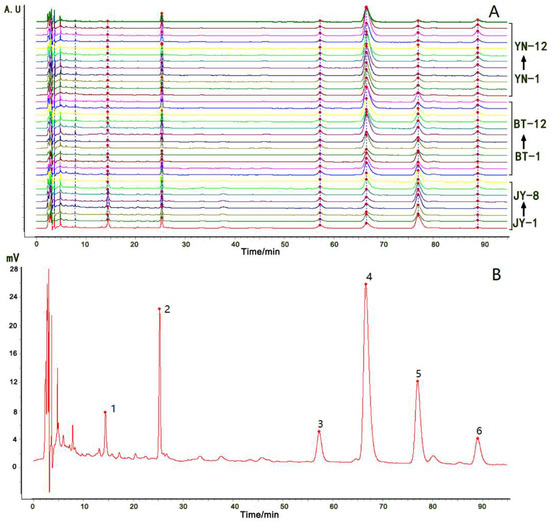 A total fingerprint chromatogram of the 32 batches of Fuzi from Jiangyou, Butuo, and Yunnan (A); a reference fingerprint chromatogram of the 32 batches of Fuzi (B); Compound 2 is benzoylmesaconine; compound 4 is hypaconitine; compound 5 is mesaconitine; compound 6 is aconitine.