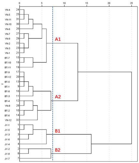HCA can show the degree of correlation between a large number of samples. The similarity or dissimilarity between all of the samples is usually represented by a tree diagram [27]. The content of the six alkaloids of the 32 batches of Fuzi were used to form a 6 × 32 data matrix. The data matrix was imported into SPSS 20.0 software. The average linkage between the groups and the square Euclidean distance were used as the standard interval for the cluster analysis. All 32 samples were divided into four major clusters (A1, A2, B1, and B2) when the squared Euclidean distance was 7.5 (Figure 5). The Fuzi from Yunnan (YN) and Butuo (BT) were characteristically closed (A1 and A2). YN-1–YN-7 and YN-9–YN-11, together with BT-7, BT-10, and BT-11, were partitioned as cluster A1. They all contained higher amounts of diester-type diterpenoid alkaloids than A2, which consisted of the remaining batches of Fuzi from Yunnan and Butuo. The samples from Jiangyou were separated into B1 and B2.